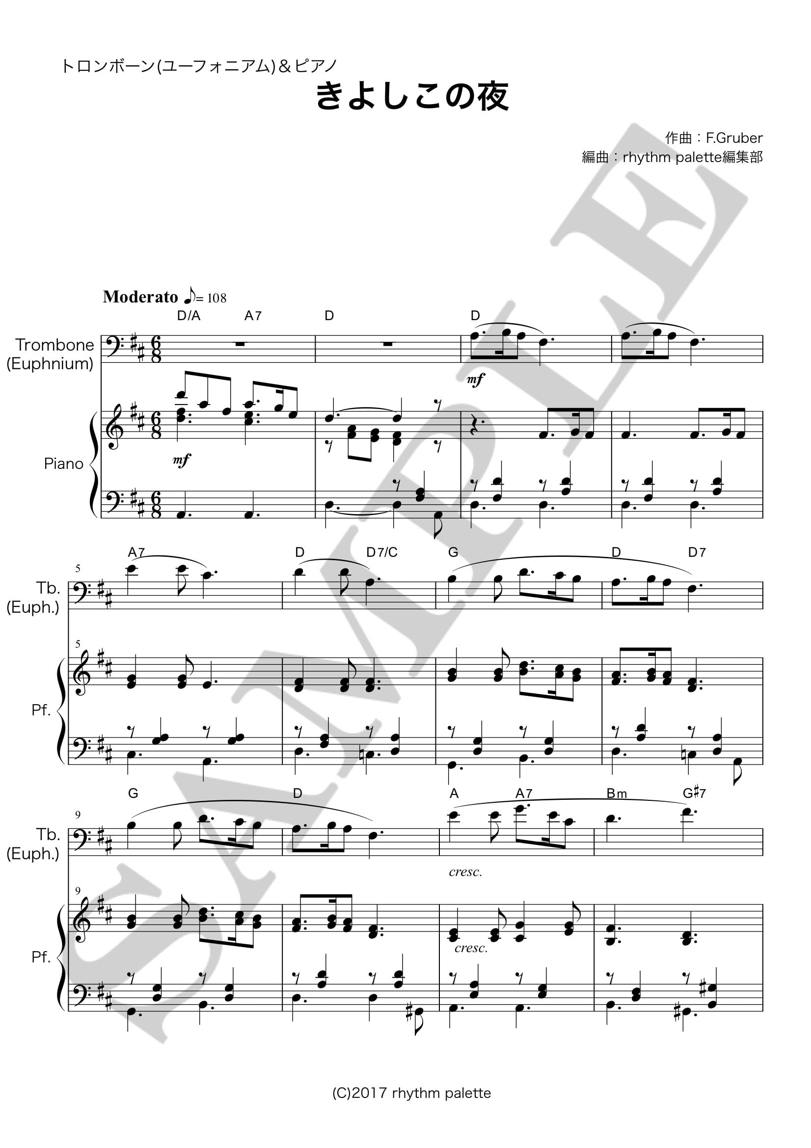 クリスマスソングきよしこの夜のトロンボーン(ユーフォニアム)譜です。